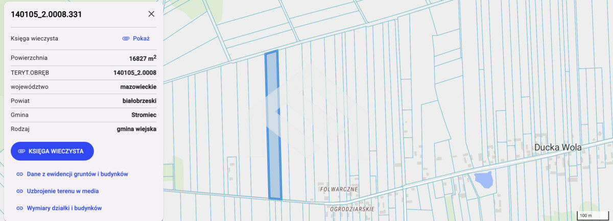Na sprzedaż działka rolna o powierzchni 16 827 m², położona w miejscowości Ducka Wola, gmina Stromiec, powiat białobrzeski.Nieruchomość stanowi bardzo dobrą propozycję dla osób szukających większego areału z potencjałem inwestycyjnym. Przy powierzchni blisko 1,7 ha grunt daje realne możliwości zarówno w kontekście użytkowania rolniczego, jak i lokaty kapitału z myślą o przyszłości.